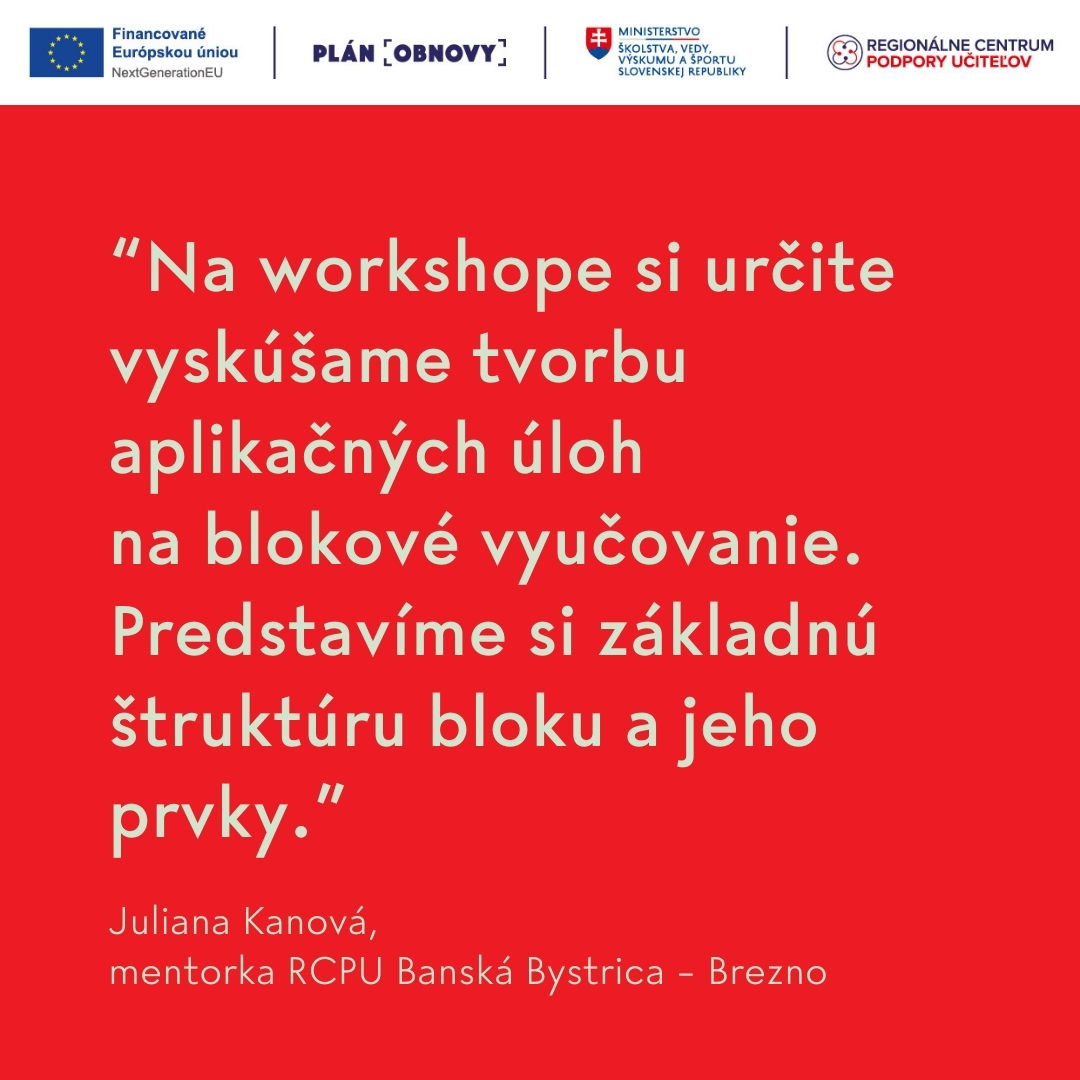 Kánová: Na workshope si účastníci a účastníčky určite vyskúšajú tvorbu už spomínaných aplikačných úloh. Predstavíme si základnú štruktúru bloku a prvky, ktoré by mal určite obsahovať. Budeme sa rozprávať aj o výhodách blokového vyučovania, ktoré ponúka deťom aj učiteľom množstvo možností prepájať, overovať a aplikovať v praxi. Určite si počas workshopu vyskúšame aj nejaké energizéry a harmonizéry, ktoré budú neskôr môcť používať aj v blokoch so svojimi žiakmi a žiačkami.
