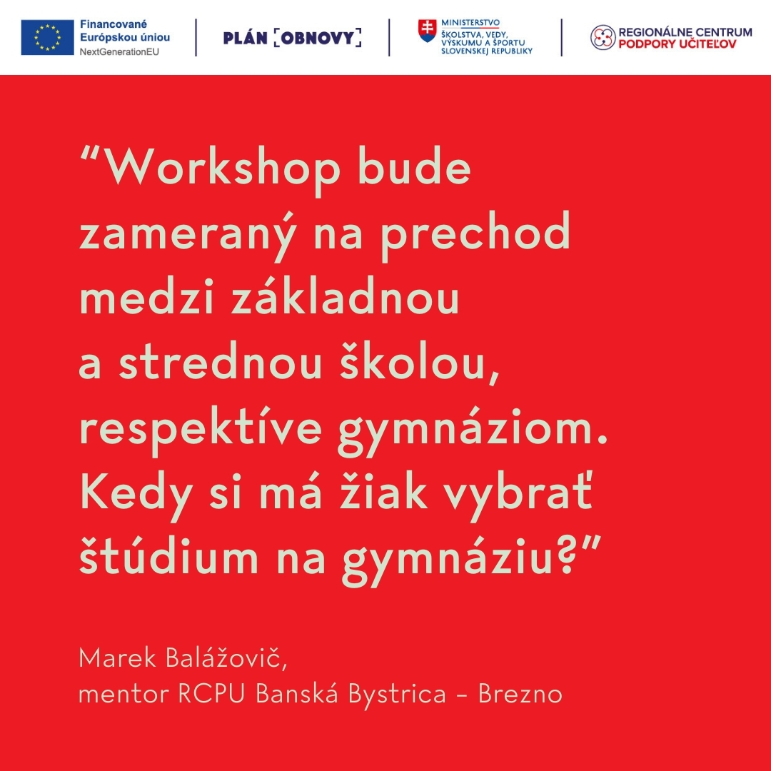 Marek Balážovič, lektor a mentor nášho RCPU pre okresy Banská Bystrica a Brezno, bude koncom februára viesť workshop pre učiteľov a učiteľky zameraný na prechod žiactva medzi základnou a strednou školou. Opýtali sme sa ho, čo si pre účastníkov a účastníčky workshopu pripravil nielen ako lektor, ale aj ako riaditeľ miestneho Tajovského gymnázia.
