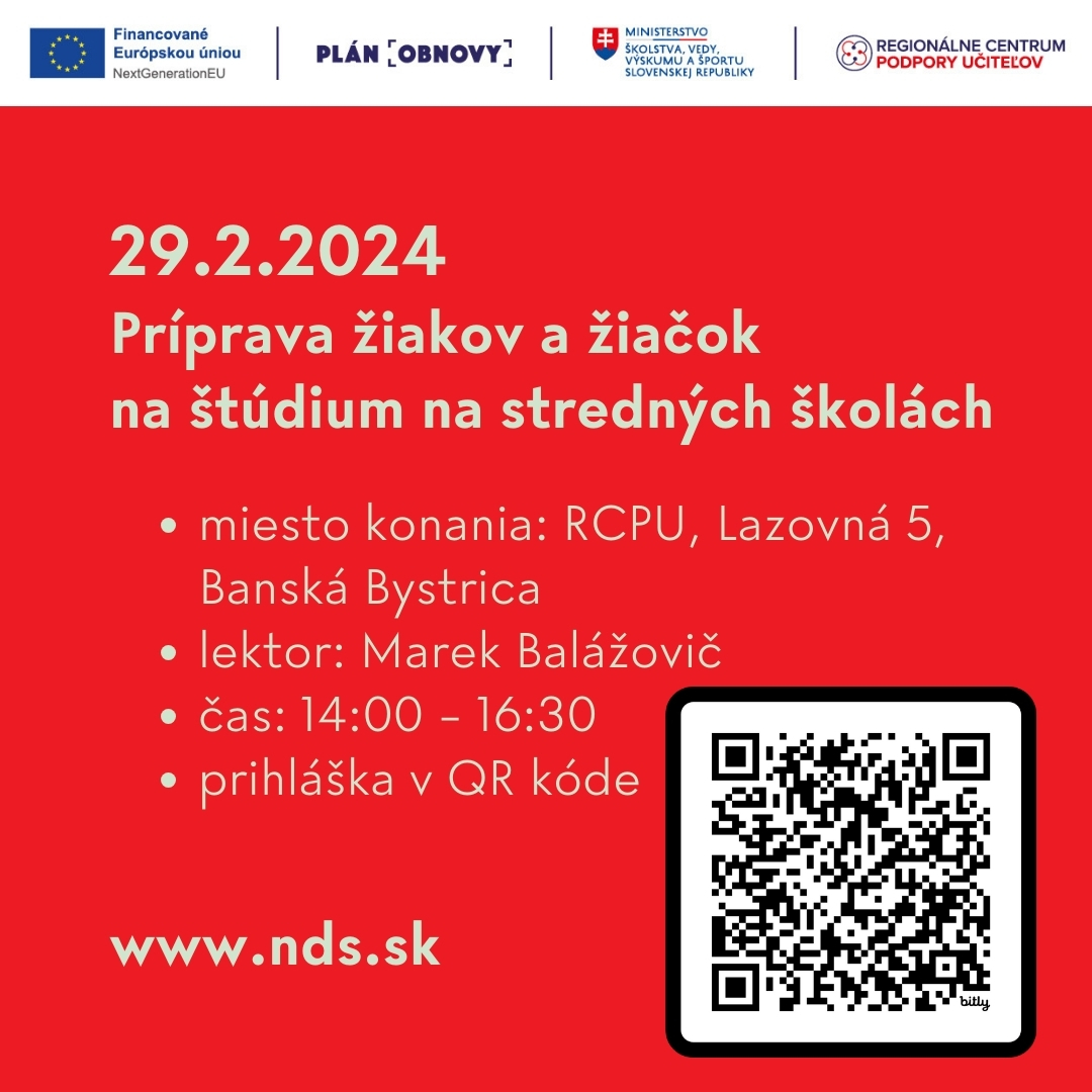 štvrtok 29.2.2024: Príprava žiakov a žiačok na štúdium na stredných školách – príležitosti a výzvy (workshop)